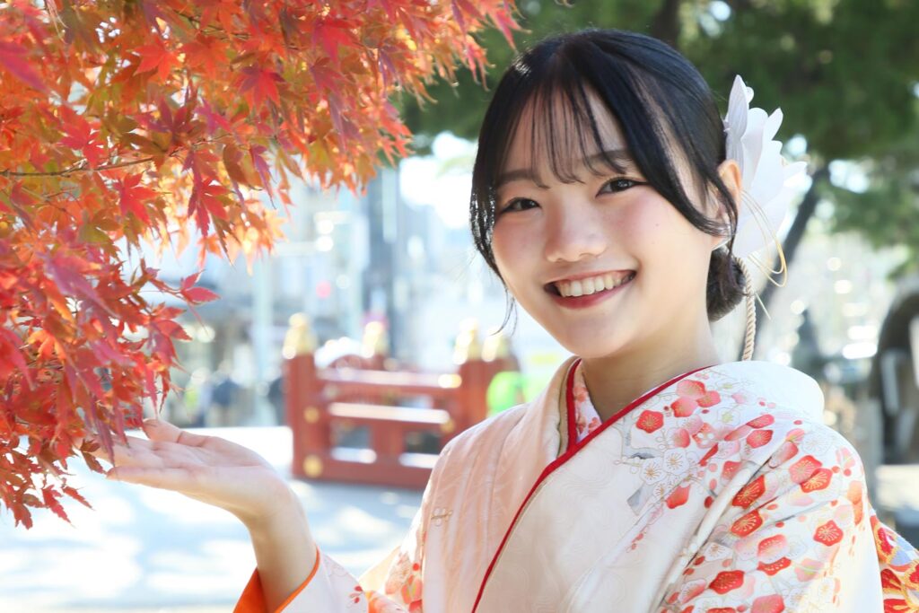 成人の記念に。古都の風情を背景にロケーション撮影。アシスタントが衣装を整えて美しく撮影します。