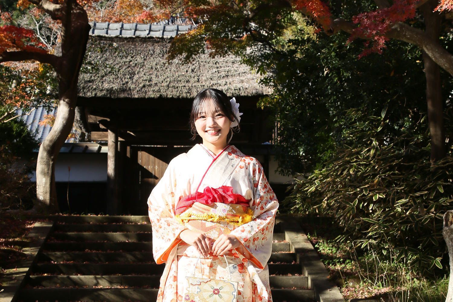 成人の記念に。古都の風情を背景にロケーション撮影。アシスタントが衣装を整えて美しく撮影します。